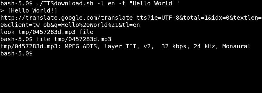 $ ./TTSdownload.sh -l en -t "Hello World!"