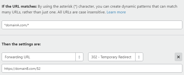 The following settings need to be configured under the domain you are redirecting from, in this example, this is domainA.com