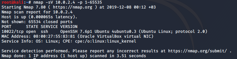 - ssh portunu varsayılandan farklı bir port yapabilirsiniz. Ssh portunu değiştirmek için /etc/ssh/sshd_config dosyasında port 22 yazan yeri istediğiniz port numarası ile değiştirerek varsayılan ssh portunu değiştirebilirsiniz. Port numarasını değiştirdikten sonra sudo systemctl restart sshd komutu ile ssh servisini tekrar başlatmanız gerekebilir. Fakat burada da port farklı da olsa, servisler nmap taramasıyla keşfedilebilir. Nmap ile servis taraması yapmak için nmap -sV 10.0.2.4 -p 1–65535 komutu kullanılabilir. Burada -p parametresi port numarası aralığı vermek için kullanılmıştır.