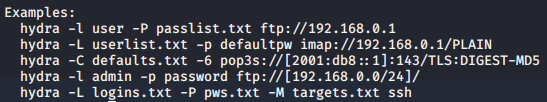 hydra -help komutu ile örnek kullanımları görebiliriz.