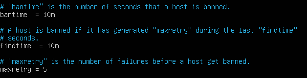 Fail2ban programının konfigürasyonları /etc/fail2ban/jail.conf dosyasında tutulur. Varsayılan ayarları değiştirmemek için jain.conf dosyasının içeriğini jail.local adında bir dosya oluşturup onun içine kopyalarsak daha sağlıklı olur. Yapacağımız değişklikleri jail.local dosyasında rahatça yapabiliriz. sudo cp /etc/fail2ban/jail.conf /etc/fail2ban/jail.local komutu ile kopyalama işlemini yapabilirsiniz. etc/fail2ban/ içerisinde jail.local dosyası varsa konfigürasyonlar bu dosyadan okunur. Şimdi ayarlarından bahsedelim.